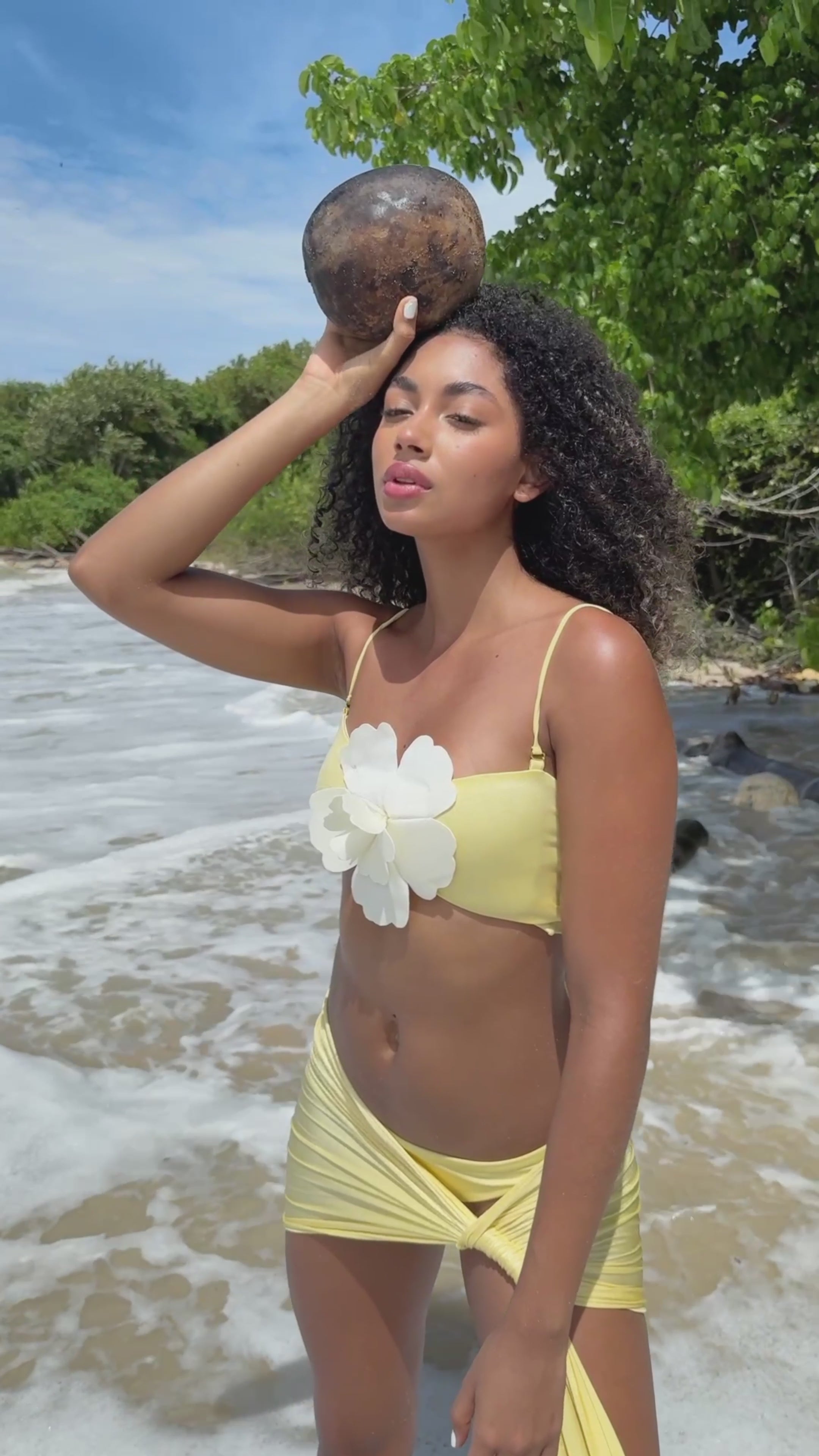 An exquisite bikini designed for the modern woman who embraces elegance and allure. The bandeau top offers versatile styling, worn effortlessly strapless or with delicate ties that fasten gracefully at the back. At its heart, a sculptural oversized flower creates a refined focal point, beautifully enhancing the bust with timeless femininity. Crafted in a rich, luminous hue, this piece embodies luxury and sophistication—perfect for unforgettable moments by the sea.